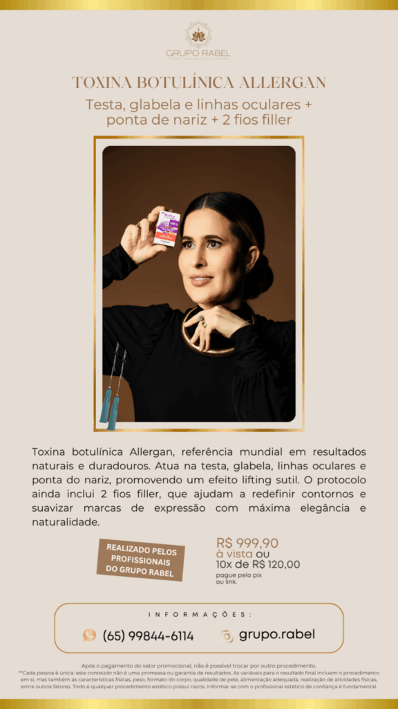 Suavize rugas e linhas de expressão com a toxina botulínica, proporcionando um efeito lifting natural, prevenindo o envelhecimento precoce e garantindo um rosto rejuvenescido e harmônico.