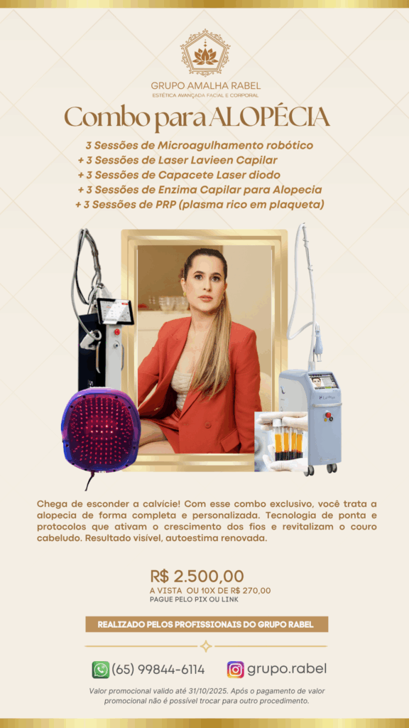 3 Sessões de Microagulhamento robótico + 3 Sessões de Laser Lavieen Capilar + 3 Sessões de Capacete Laser diodo + 3 Sessões de Enzima Capilar para Alopecia + 3 Sessões de PRP (plasma rico em plaqueta)